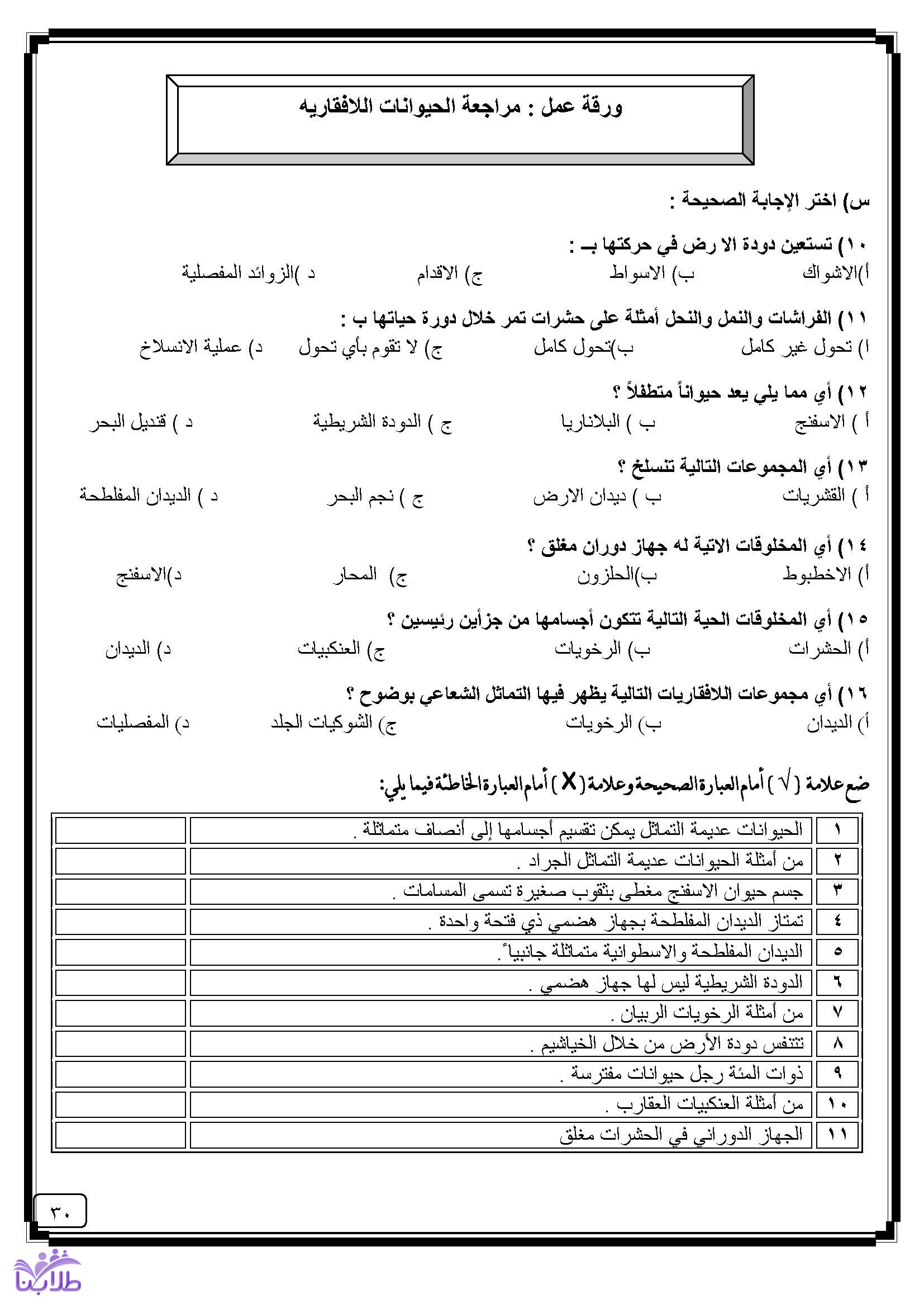 ورقة عمل مراجعة الحيوانات اللافقارية علوم اول متوسط
