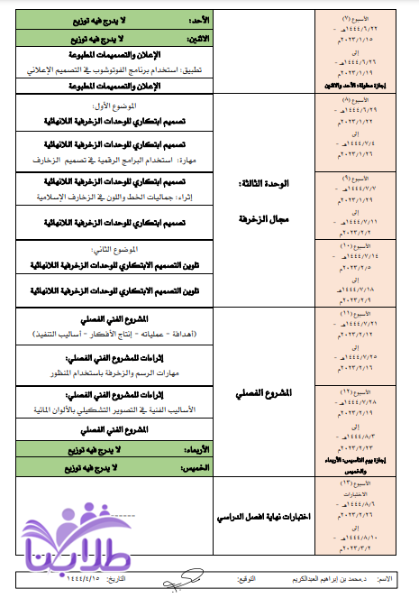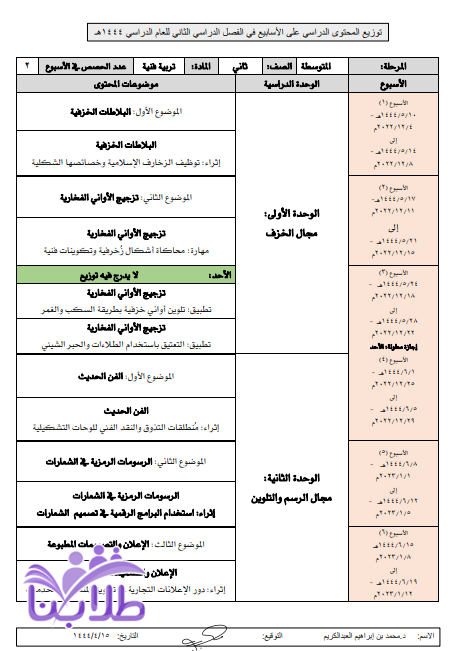 توزيع التربية الفنية للصف الثاني متوسط ف2